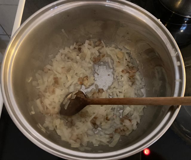 Připravíme si kastrůlek a nalejeme do něj trochu oleje. Nasypeme nadrobno nakrájenou cibuli, kterou orestujeme dozlatova, já přidávám ještě trochu špeku.