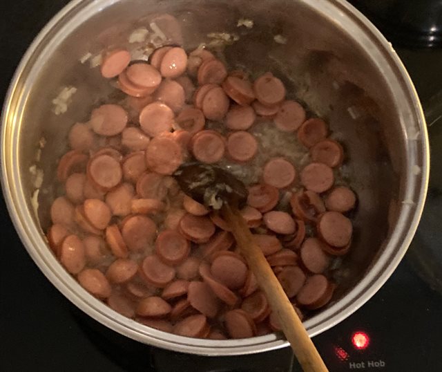 Přidáme na kolečka nakrájené párky a znovu restujeme, potom přidáme ještě rozdrcený česnek.