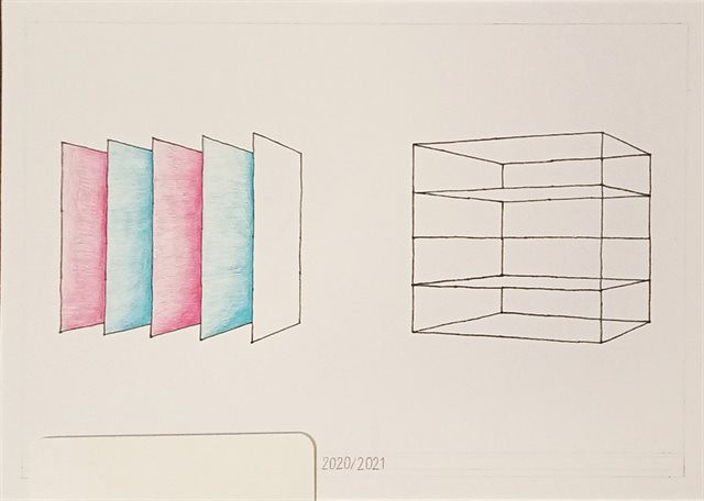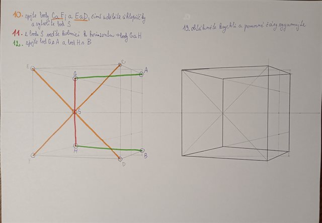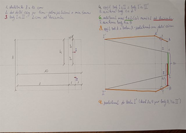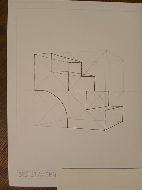 Podle minule hodiny a hlavně dělení čtverce si udělejte tyhle schody. Radím začínat tou zadní stranou, kde si zvýrazníme potřebné boty a pak to samé v přední straně a body pak jen pospojujete. Ty části, které nejsou vidět můžete udělat čárkovaně nebo nemusíte zbavit vůbec